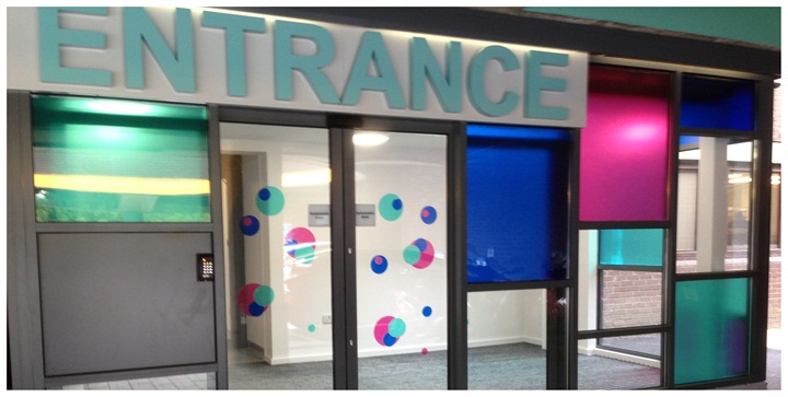As well as the manifestation, which was cut from The Window Film Company's range of rainbow film, it was decided to extend the injection of colour to other panes surrounding the entrance. The nature of the rainbow film provides an instant change in appearance whilst not impacting on the view in or out, or cutting down on the light passing through the glazing.